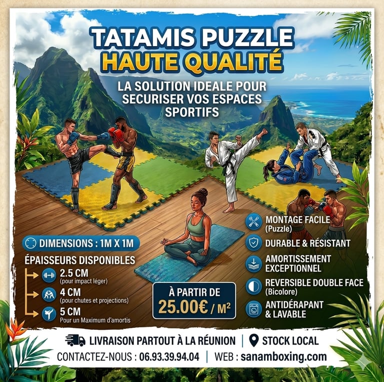 Nos tatamis sont en mousse EVA «Ethylène Vinyl Acétate» de haute qualité, offrant une grande résistance.